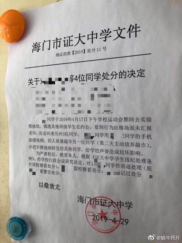 视频越传越广,后被学校发现,发了处分将三人全部开除。