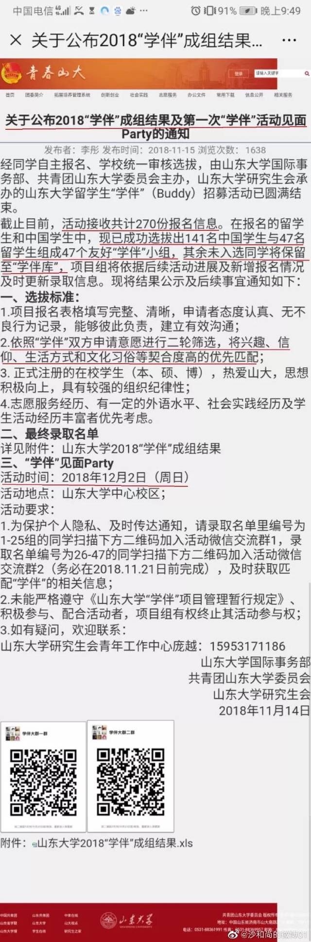 有网友投稿:“山东大学 去年发布为外国留学生招纳学伴风波受到众多网友批评后,在2018年7月份发布通知,宣布“继续招收学伴”……”接到投稿,小编赶紧去围观,发现2018年学伴选拨结果已经公示了,比2017年有较大变化。2017年为1对1配对,而2018年呢?采取1对3,即每个留学生配3个学伴。