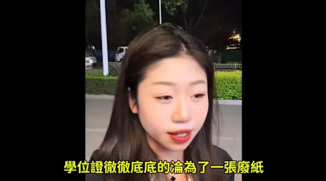 女子說得很直白「我做過最後悔的事就是上大學!」好不容易考上也唸完了,應該苦境甘來,沒想到連一份月薪5千人民幣的工作都找不到,只能先送外賣快遞來維持溫飽,我的學位證(中國用語)徹徹底底淪為一張廢紙,我這個大學生也徹徹底底變成人家口中的笑柄,甚至是反面教材。