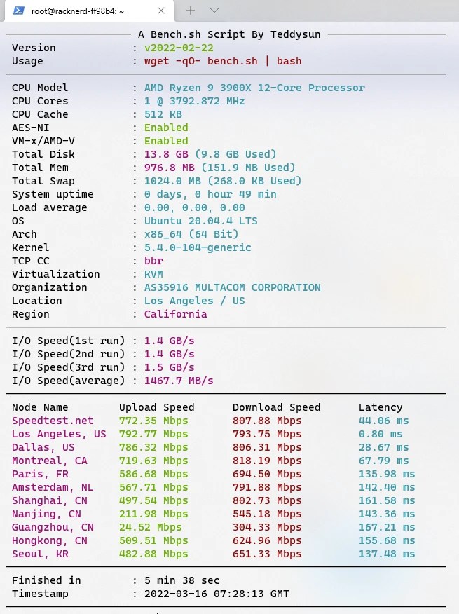 我感觉RackNerd还行(也有可能是部分套餐还行,下图是我买的AMD处理器+NVME固态+DC02机房